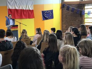 Durch kurzweilige persönliche und unterhaltsame Texte und Anekdoten führte Herr Dr. Matthias Kneip die Schülerschaft in den Alltag der polnischen Bevölkerung und in polnische Geschichte ein. Er begeisterte Schülerinnen und Schüler durch seine anschaulichen Erzählungen über polnischen Nationalstolz und ihren Freiheitsdrang, Gastfreundschaft, Begrüßungs- und Speiserituale – immer im Vergleich zu Bekanntem aus bundesrepublikanischer Erfahrung. Auch die Liebe sparte er nicht aus. Weiterhin gab er Einblicke in aktuelle polnische Politik und das polnische Verhältnis zu Europa, dessen Spektrum von Skepsis, vertreten durch die derzeitige nationalkonservative Regierung, bis zu ungeteilter Begeisterung für Europa reicht. Die abschließende Diskussion zeigte, dass nationalistische Bestrebungen unter der Schülerschaft keine Resonanz finden.