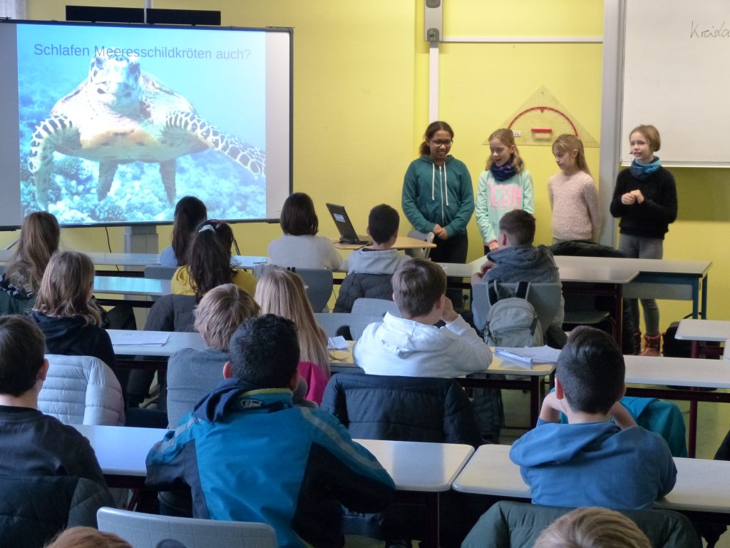 Nach einer allgemeinen Einführungsveranstaltung und Verteilung der Themen ging es direkt los: in Kleingruppen machten sich die 108 Orientierungsstufenschüler*innen daran, ihr Thema zu erkunden und versuchten, eine Fragestellung, die sich mathematisch ergründen ließ, zu entwickeln. Dabei waren den Schwerpunkten und der Interessenlage der jungen Menschen keine Grenzen gesetzt: So telefonierte ein Team der 5a beispielsweise mit mehreren Zoos, um genaue und verlässliche Informationen zum Verhalten von Schildkröten zu bekommen, andere starteten kleine Umfragen in den Klassen, um verwertbare Daten zu erhalten, und im Internet wurde ausgiebig nach brauchbaren Daten und Informationen recherchiert .