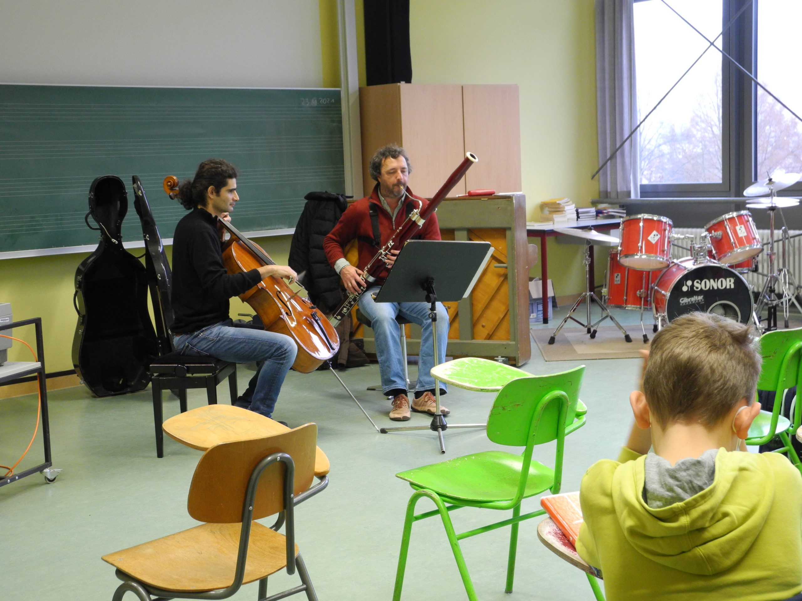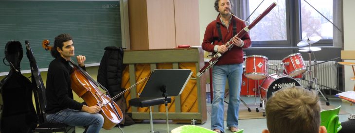 Einen Musikunterricht der besonderen Art durften die Klassen 5 erfahren, als zwei Mitglieder der Rheinischen Philharmonie Koblenz – Nikolaus Maler (Fagott) und Yoël Cantori (Cello) – sie im Musikraum der Schule auf eine Reise durchs Orchester mitnahmen. Hierzu eingeladen hatte Fachlehrerin Christa Böhler.