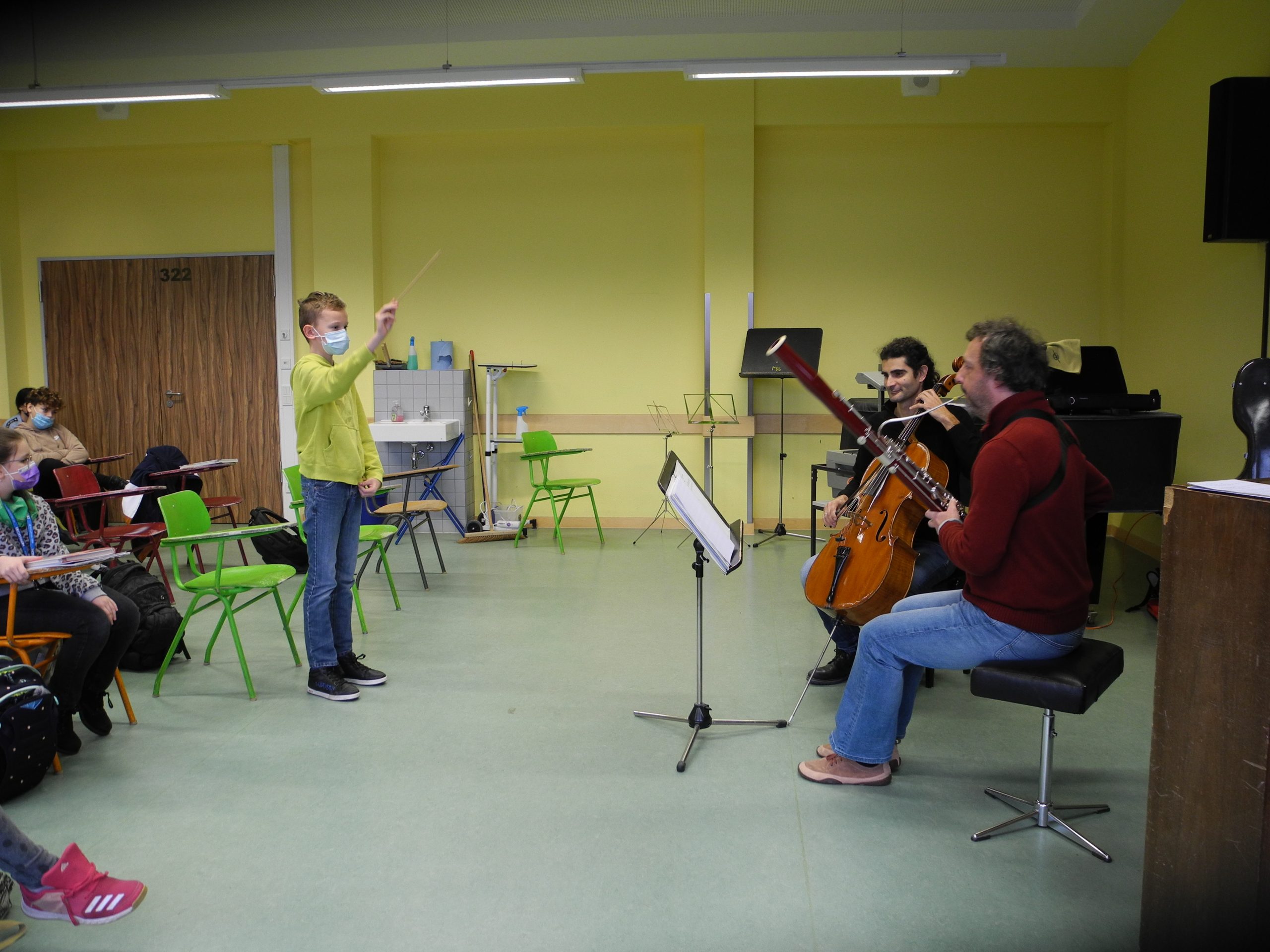 Einen Musiker gibt es im Orchester, der ohne Instrument auftritt: Das ist der Dirigent. Und so durften sich am Ende der Musikstunde mutige Schüler:innen in dieser Rolle probieren: Egal, welches Tempo sie vorgaben, Nikolaus Maler und Yoël Cantori folgten dieser Leitung!