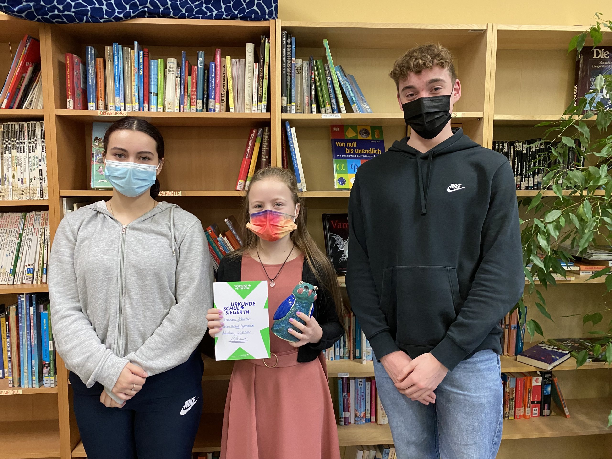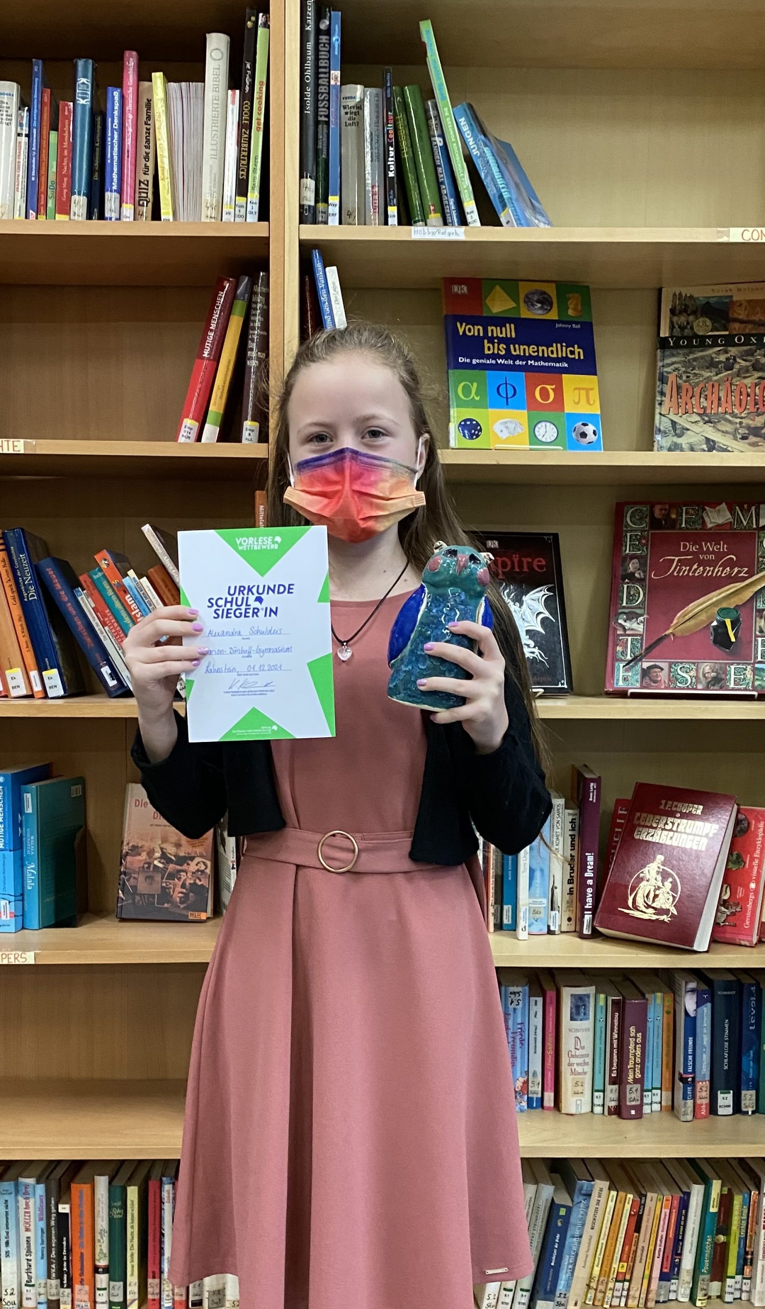 Alexandra Schuldeis aus der Klasse 6b ist am Marion-Dönhoff-Gymnasium die beste Vorleserin. Die Sechstklässlerin setzte sich im Finale gegen drei Mitschüler:innen durch. Damit qualifiziert sie sich nach dem Schulentscheid für die nächste Runde des Wettbewerbs – den Kreisentscheid, der Ende Januar 2022 stattfindet.