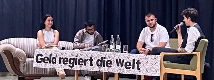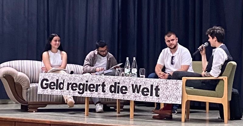 Drei Schulstunden lang ging es also am 13. Juni 2022 um antikapitalistische Überlegungen, zunächst im direkten Interview mit der Gästin, durch das auf dem Podium drei Schüler:innen des Leistungskurses Sozialkunde, Luka Klima, Alisha Mereu und Wjatscheslaw Kosian, führten, bevor die Diskussion für die übrigen Teilnehmer:innen geöffnet wurde.