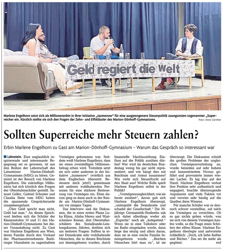 Angeregt durch Claudia Stein, Fachlehrerin für Geschichte und Sozialkunde, bot sich Mitte Juni den Schülerinnen und Schülern der Stufen 10 und 11 die Gelegenheit, mit der in jüngster Zeit durch die Medien und in den sozialen Netzwerken bekannt gewordenen Millionenerbin in spe Marlene Engelhorn ganz real ins Gespräch zu kommen.