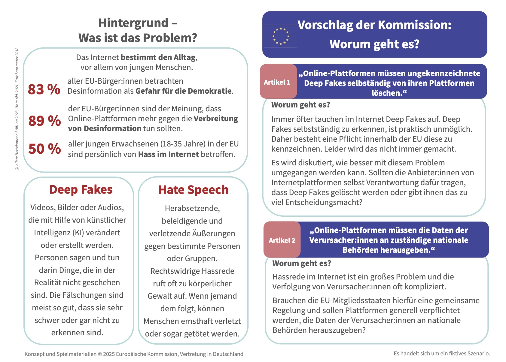 Am 19. September erlebten die Klassen 10a und 10b einen besonderen Schultag: Beim Planspiel „Fakt oder Fake“, das von der Europäischen Kommission in Zusammenarbeit mit planpolitik entwickelt wurde, schlüpften die Schüler/innen in die Rolle von Abgeordneten des Europäischen Parlaments. Ziel war es, politische Entscheidungsprozesse hautnah erfahrbar zu machen und zugleich ein hochaktuelles Thema zu behandeln – den Umgang der EU mit Desinformation, sogenannten Deep Fakes, und Hassrede im Internet.