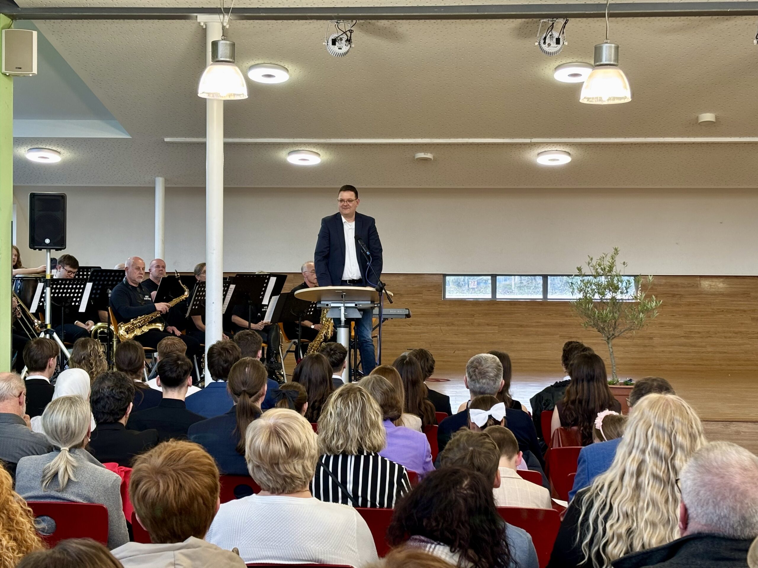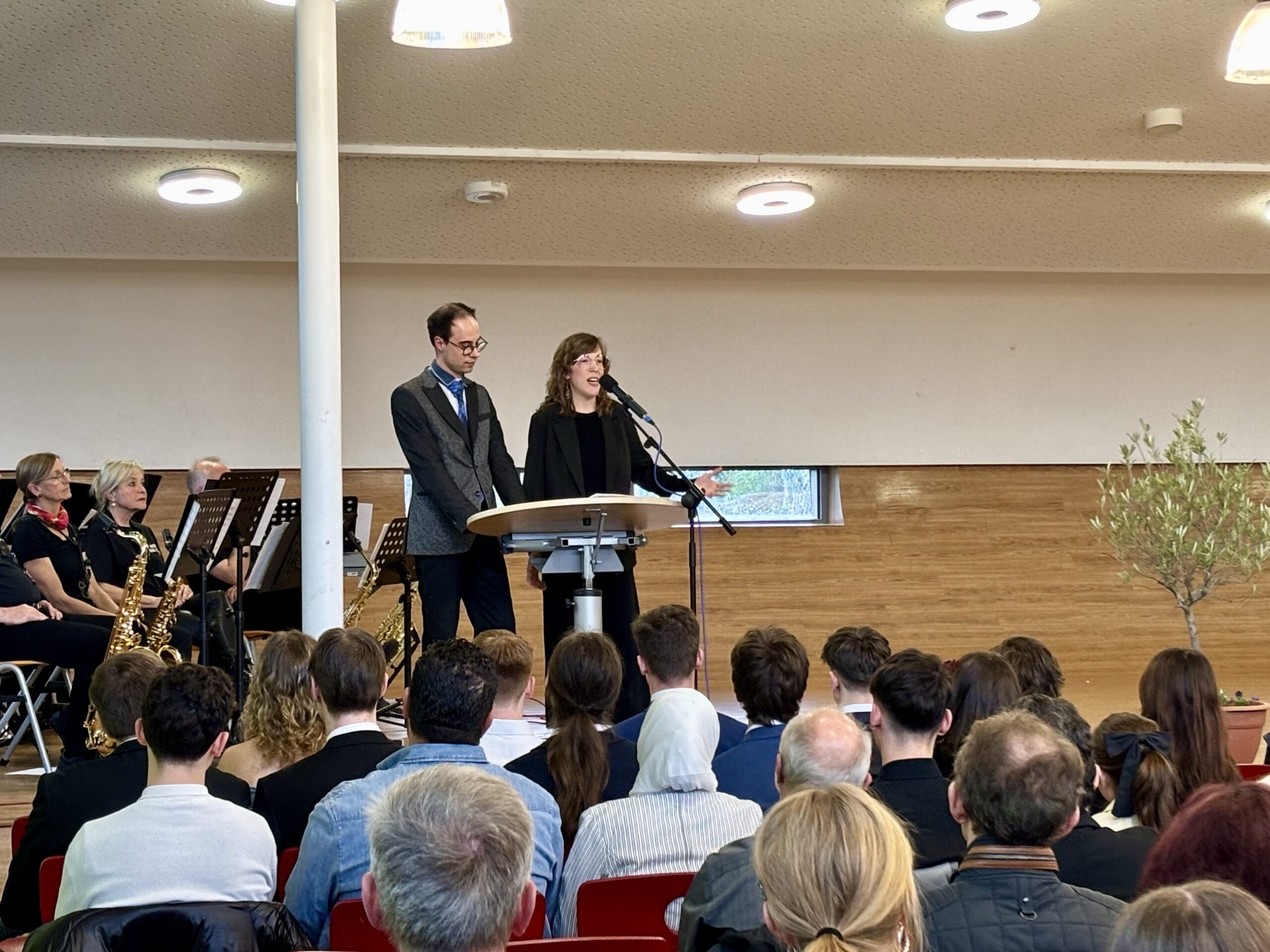 Die feierliche Zeugnisverleihung fand in der Mensa der Schule statt und wurde von musikalischen Beiträgen der Big Band (Leitung: Thomas Burbach) und des Unterstufenchores mit der Unterstützung einiger Lehrkräfte (Leitung: Yannick Wahl) gestaltet. Die kommissarische Schulleiterin Linda Stenger durfte in diesem Jahr zum ersten Mal die Leistungen der Abiturientinnen und Abiturienten würdigen. Für die Stadt Lahnstein richtete der Oberbürgermeister Lennart Siefert sein Wort an die Abiturientinnen und Abiturienten und der Schulelternbeirat vertreten durch Jens Müller beglückwünschte den Jahrgang. Die Lehrkräfte Heike Dommermuth und Yannick Wahl lieferten sich einen unterhaltsamen Schlagabtausch in ihrer Lehrerrede und gaben dem Jahrgang mit zahlreichen Anekdoten alles Überlebenswichtige mit auf den Weg. Die Schülerin Annalena Schall schließlich klärte das Publikum über das Abimotto ihres Jahrgangs auf und spannte hiermit den Bogen zu den letzten neun Jahren bis zu ihrem Abschluss, welchen sie noch vor der Veröffentlichung der neuesten Version von Grand Theft Auto (GTA) schaffen konnten. Sie haben ihr Ziel offensichtlich erreicht.