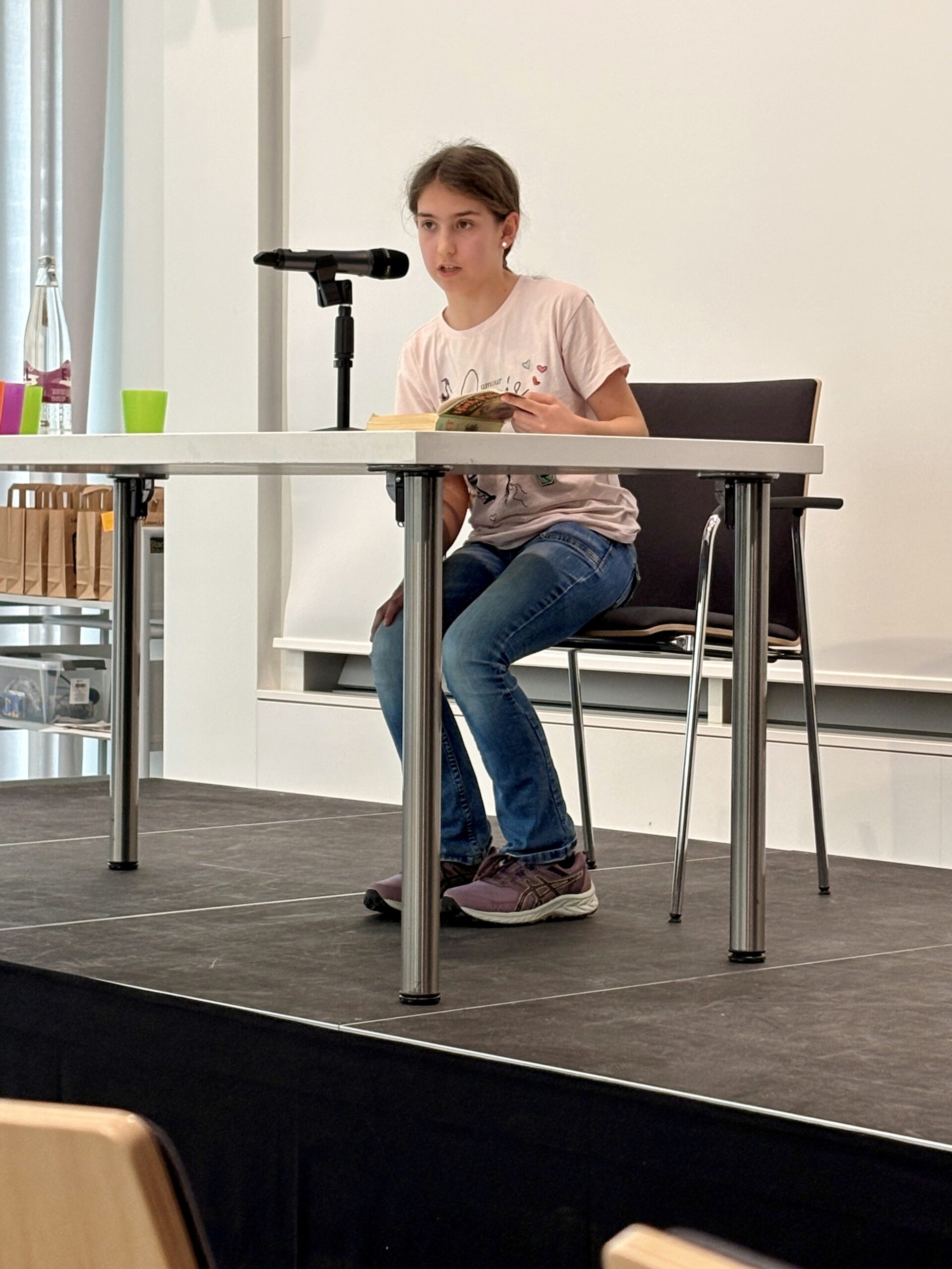 Beim Schulentscheid überzeugte Mona bereits mit einer spannenden Lesestelle aus dem Fantasy-Buch Froststerne und sicherte sich damit den ersten Platz an unserer Schule.