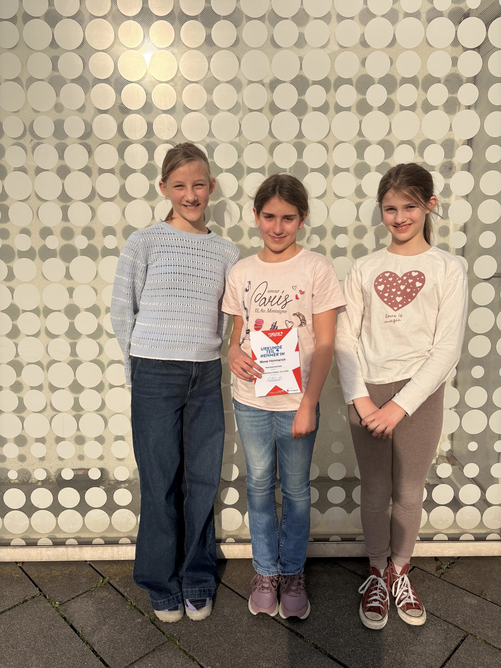 Begleitet und unterstützt wurde Mona sowohl beim Kreis- als auch beim Bezirksentscheid von ihren Mitschülerinnen und Freundinnen Emilia und Helena sowie von ihrer Mutter. Beim Bezirksentscheid war zudem ihre Lehrerin Frau Caspari an ihrer Seite.